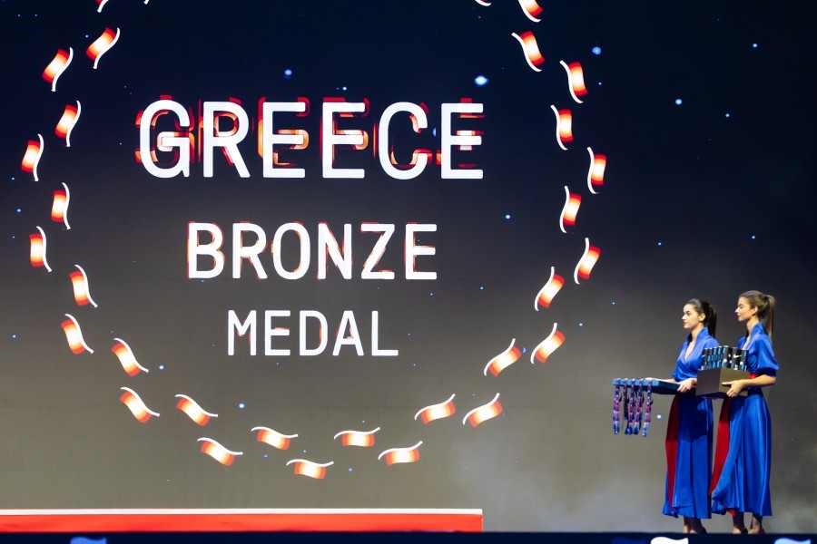 Το χάλκινο μετάλλιο στους διεθνείς μας παίκτες και το τεχνικό τιμ απένειμαν από κοινού ο Αναπληρωτής Υπουργός Αθλητισμού Γιάννης Βρούτσης και ο Πρόεδρος της ΕΟΕ Ισίδωρος Κούβελος.