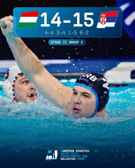 Μετά από ένα συγκλονιστικό παιχνίδι στην κατάμεστη από 12.000 θεατές «Belgrade Arena», η Σερβία θριάμβευσε με αντίπαλο την Ουγγαρία (15-14) στο μεγάλο ντέρμπι και πέρασε πλέον στην πρώτη θέση του Ε’ ομίλου του ευρωπαϊκού πρωταθλήματος που διεξάγεται στην έδρα της, το Βελιγράδι. Παράλληλα εξασφάλισε την παρουσία της στα ημιτελικά της διοργάνωσης και με ένα βαθμό στο τελευταίο της παιχνίδι θα περάσει και ως πρώτη. Η Ισπανία επικράτησε της Γαλλίας, και πλέον στην αναμέτρηση της Τρίτης, 20/1 ανάμεσα στην Ισπανία και την Ουγγαρία θα κριθεί το δεύτερο εισιτήριο στην τετράδα.