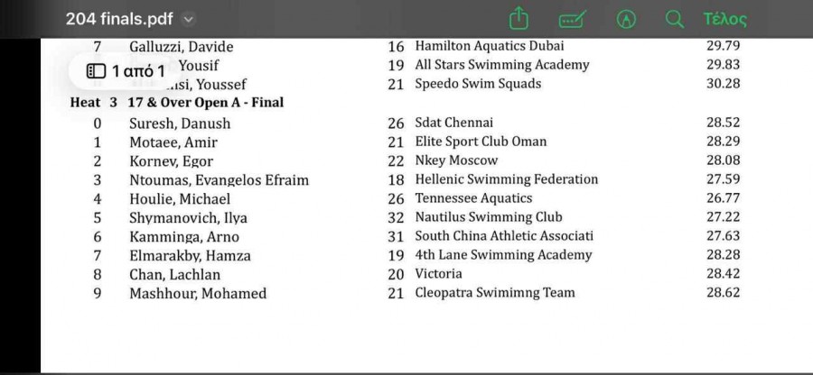 Με μια σπουδαία επίδοση συνέχισε τις εμφανίσεις του στη δεύτερη μέρα του πρωταθλήματος κολύμβησης στο Ντουμπάι (Dubai Open Swimming Championships) ο Ευάγγελος Εφραίμ Ντούμας.